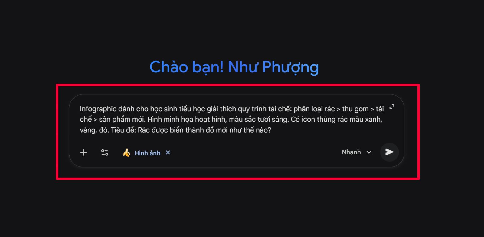 Ví dụ: Mình sẽ tạo một bản infographic dành cho học sinh tiểu học với chủ đề thu gom rác tái chế và quy trình xử lý rác.