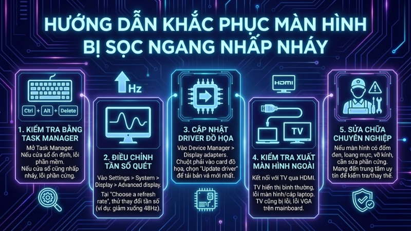 Màn hình laptop bị giật, xuất hiện sọc ngang hoặc nhấp nháy liên tục là lỗi khá phổ biến mà nhiều người dùng gặp phải. Tình trạng này không chỉ gây khó chịu khi sử dụng mà còn ảnh hưởng trực tiếp đến công việc, học tập và giải trí. Vậy nguyên nhân do đâu và cách sửa lỗi màn hình laptop bị giật sọc ngang nhấp nháy tại nhà như thế nào hiệu quả?